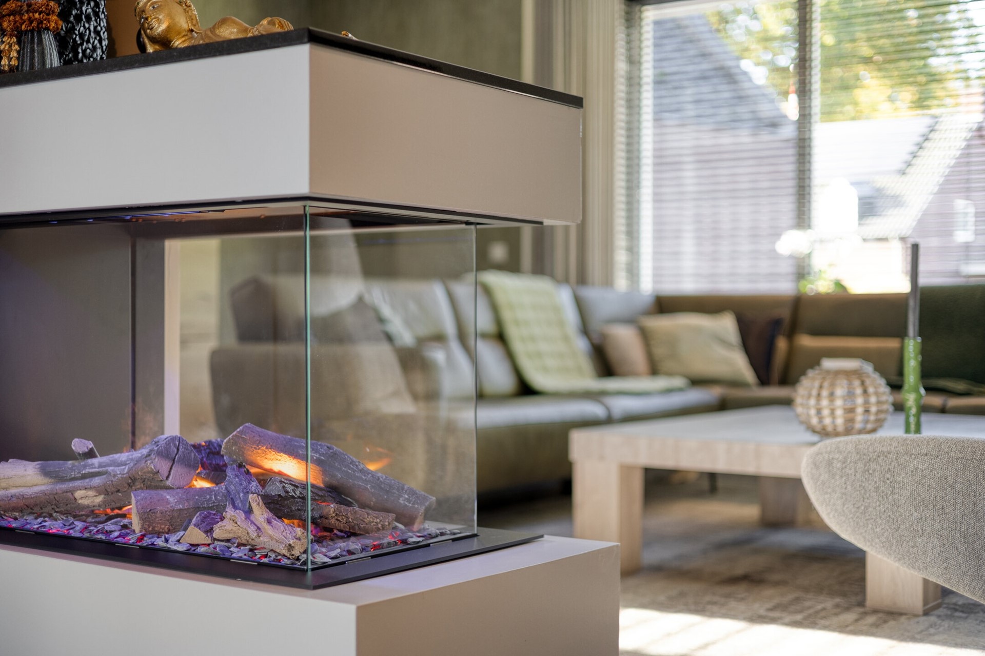 Zodra je binnenkomt, trekt de royale vouwdeur van vijf meter zich meteen in de aandacht. Schuif ‘m open en je woonkamer loopt moeiteloos over in de tuin. De waterdamp sfeerhaard van Faber geeft je ’s winters een knusse ambiance en in hartje zomer gooi je de buitenwereld lekker naar binnen.