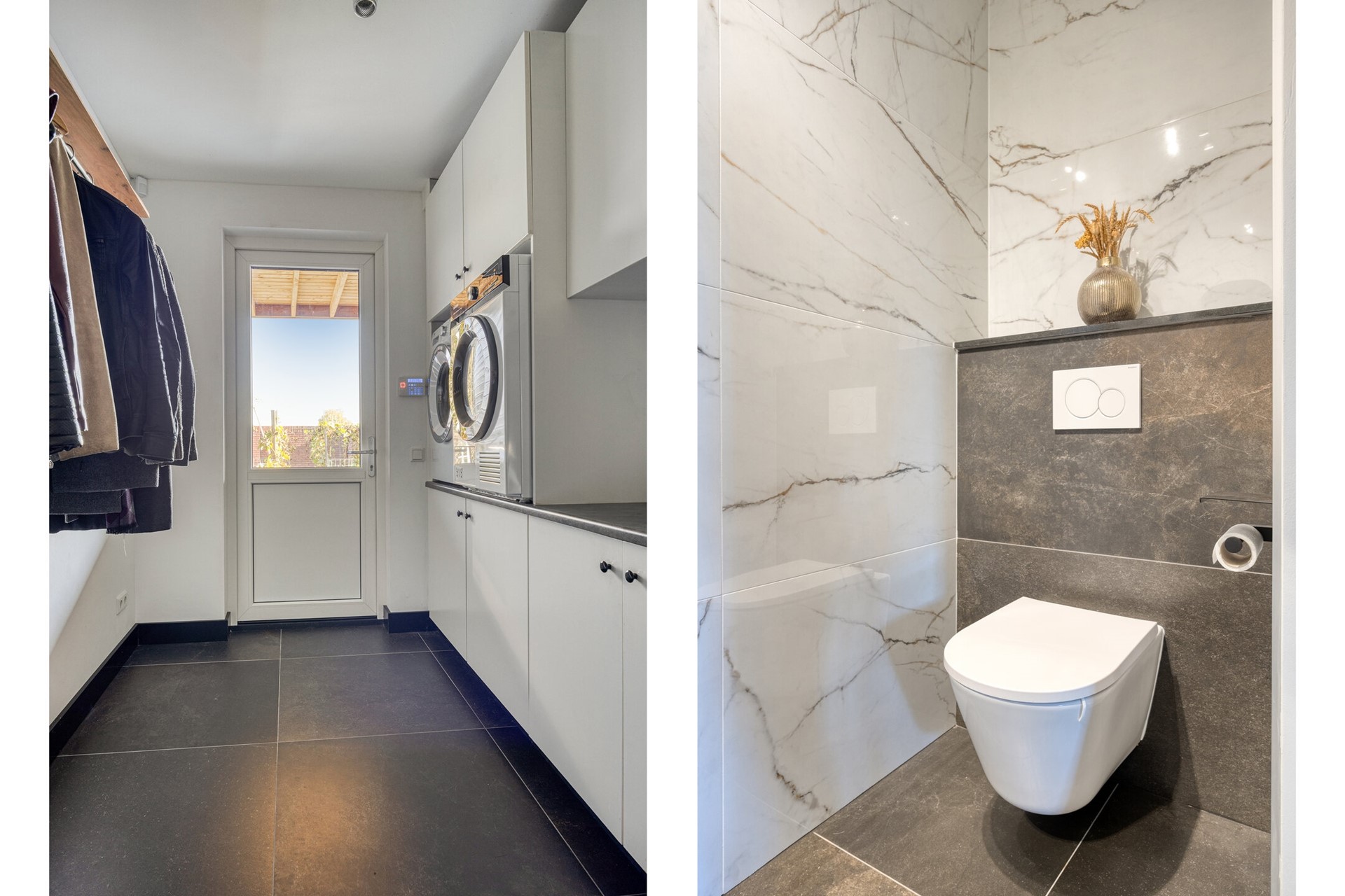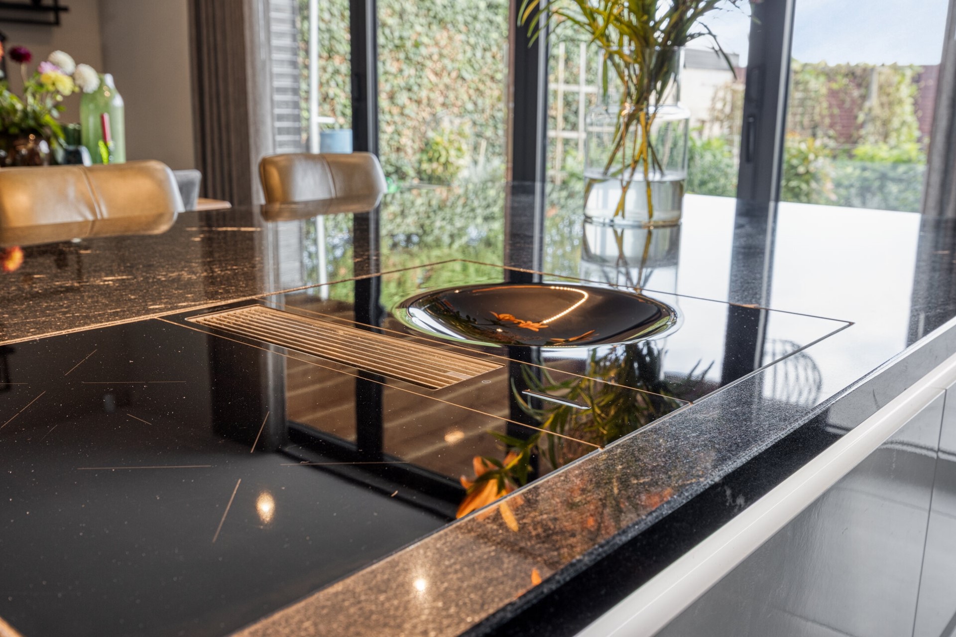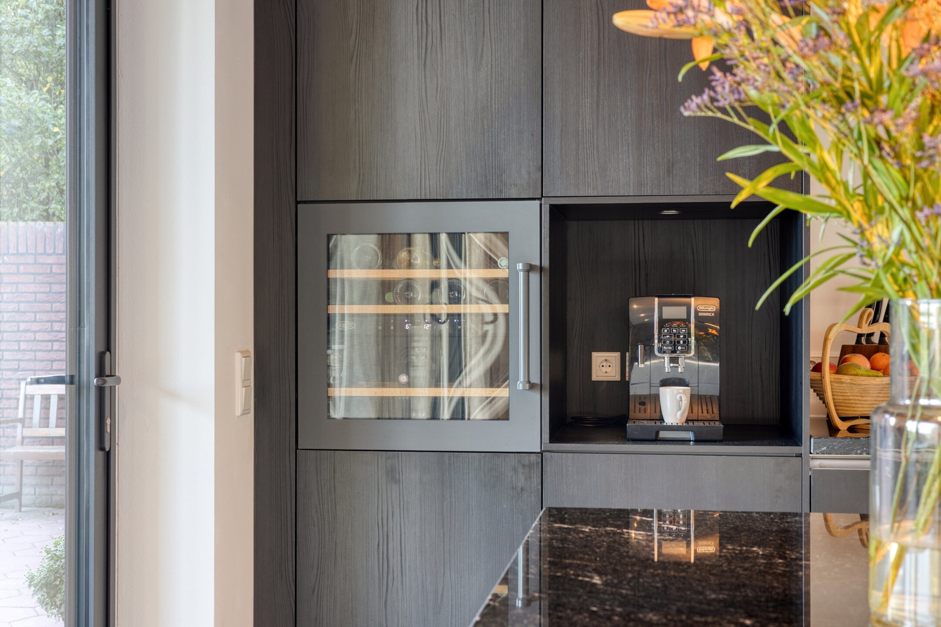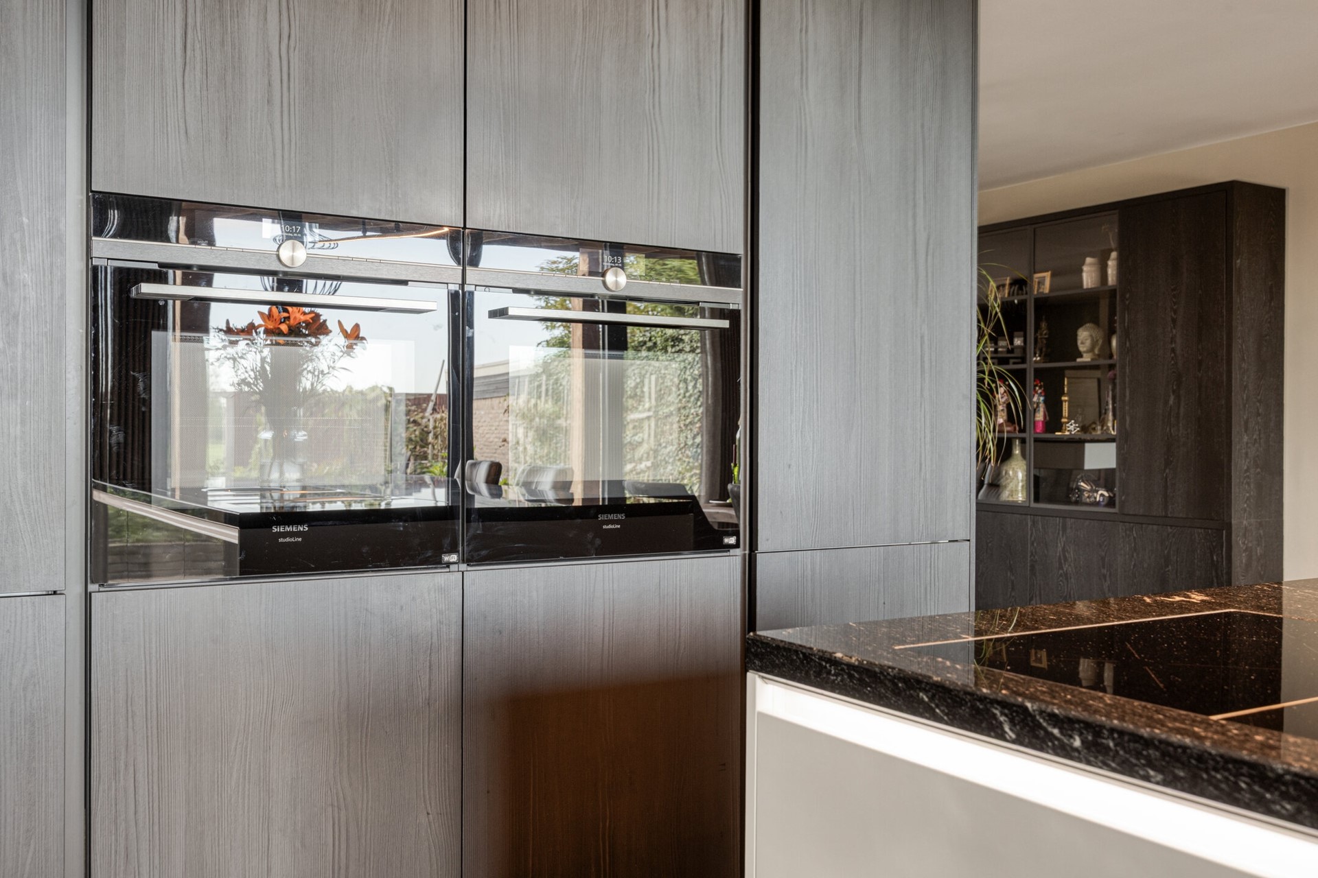 De keuken is er eentje voor fanatieke thuiskoks. Hier tref je werkelijk alles: een Bora Classic 2.0 dubbele inductiekookplaat en geïntegreerde inductiewok, twee moderne koel/vriescombinaties, een Siemens stoomoven én magnetron, een Quooker kraan, Siemens vaatwasser. De keuken is hoogwaardig afgewerkt met sfeervolle onderverlichting onder het granieten aanrechtblad en als kers op de taart een Boretti wijnklimaatkast. Perfect voor etentjes met vrienden of familie. In de naastgelegen bijkeuken zit je witgoed trouwens op fijne hoogte weggewerkt.