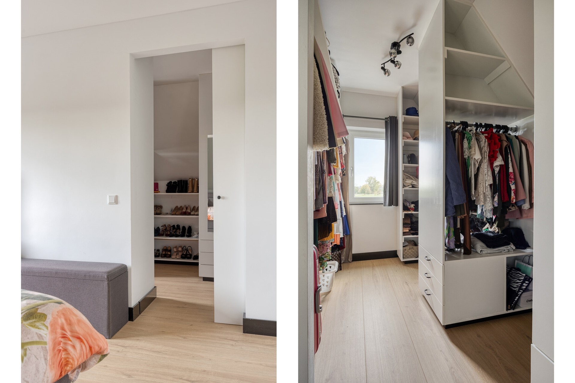 Ook boven is het royaal: de masterbedroom is uitgerust met een riante inloopkast en vrij uitzicht over de omgeving. Daarnaast zijn er nog twee gezellige slaapkamers voor kids, logés of extra werkruimte. De badkamer is een ware wellnessplek geworden, met dubbele inloopdouche, lig-/zitgedeelte met elektrische verwarming , stoomgenerator en bubbelbad. Het dubbele wastafelmeubel maakt het plaatje compleet. Je hebt rechtstreeks toegang tot het platte dak waar je misschien ooit een dakterras met jacuzzi creëert.